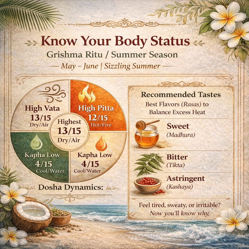 The calendar explains Dosha Dynamics (High Vata/Pitta, Low Kapha) and required tastes (Sweet, Bitter, Astringent) so you know exactly why you feel tired or hot.