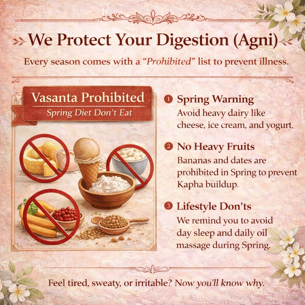- No Heavy Fruits: Bananas and dates are prohibited in Spring to prevent Kapha buildup.